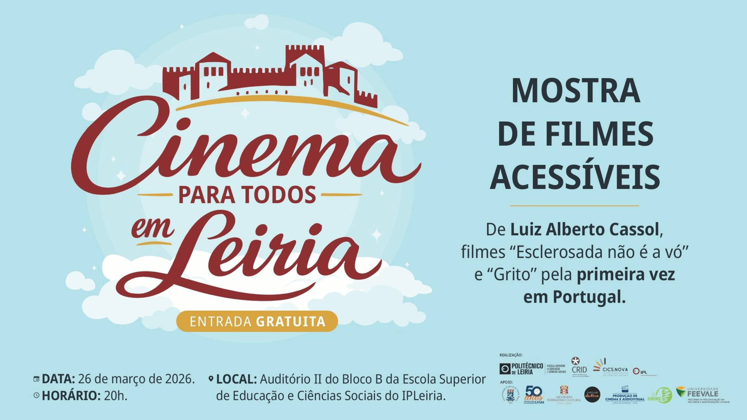 No decorrer da sessão, vão ser exibidas, pela primeira vez em Portugal, duas curtas-metragens do cineasta brasileiro Luiz Alberto Cassol, “Esclerosada Não é a Vó” e “Grito”. As obras incluem recursos de acessibilidade como audiodescrição (AD), Libras (Língua Gestual Brasileira) e legendas descritivas (LSE).